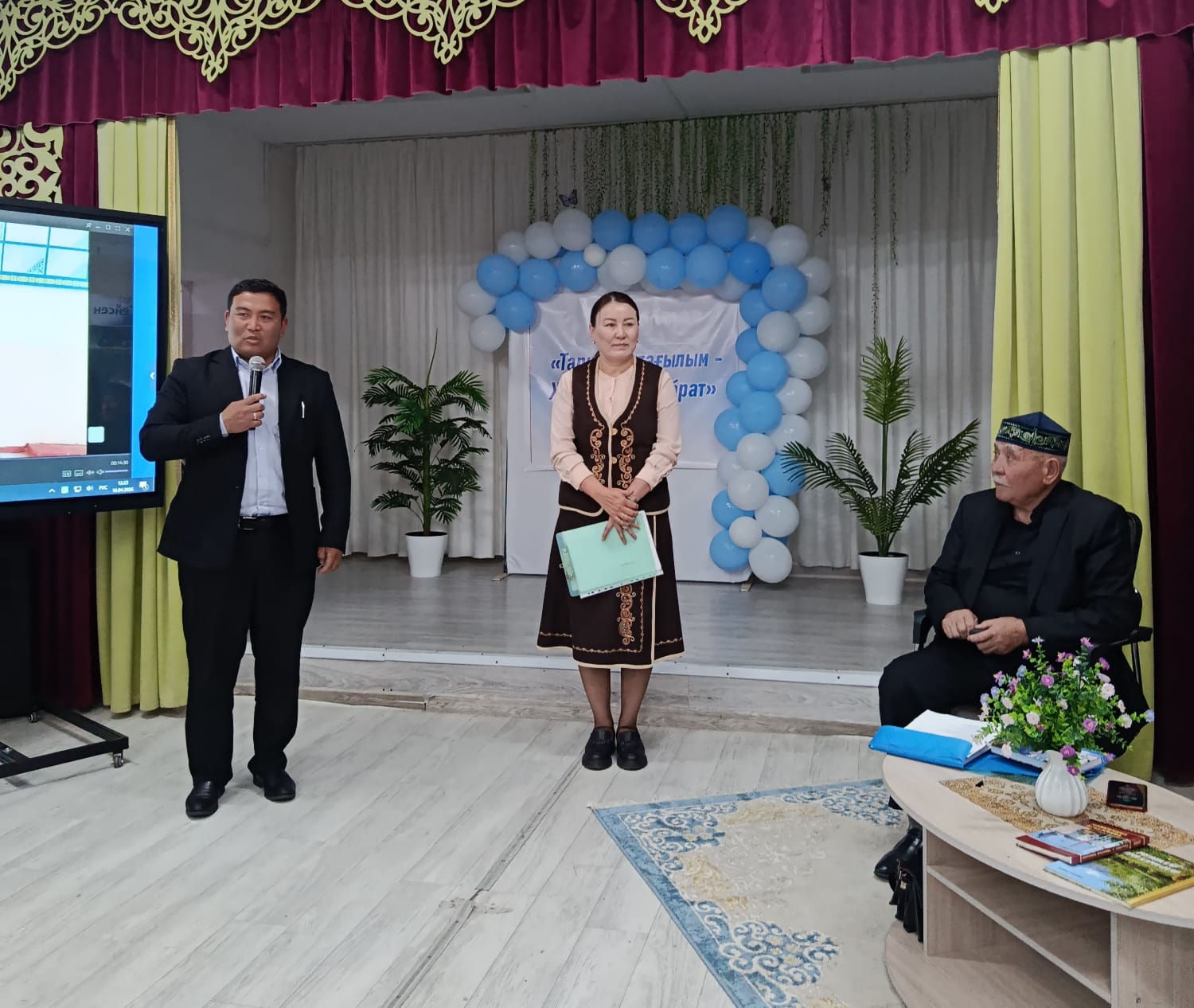 Продолжив мероприятия, перед соб­равшимися выступил директор ОШ №4 Илияс Садыкулы Жунисжанов, ко­торый поблагодарил известного жур­налиста, писателя, переводчика, поэта, члена Союза журналистов Казахстана Сейсена Кожеке за то, что он принял участие в мероприятии, много рассказал интересного о своей жизни, творческом пути. Также директор поздравил его с наступающим юбилеем – 75-летием и в знак глубокого уважения надел на него чапан, преподнес ему памятный подарок и букет цветов, которые символизировали гостеприимство и радость встречи.
